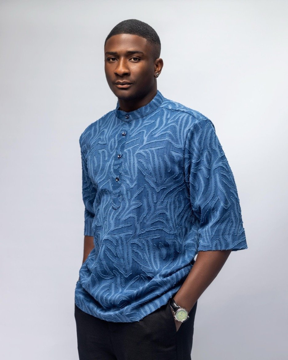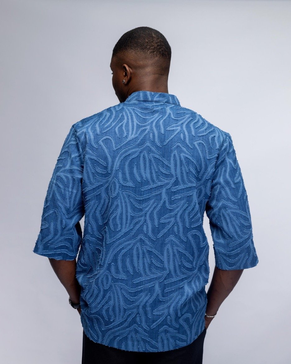 This shirt is a stylish, modern men’s short-sleeve, button-up, with a sophisticated textured design that’s perfect for elevated casual or semi-formal looks, especially in a warm climate.